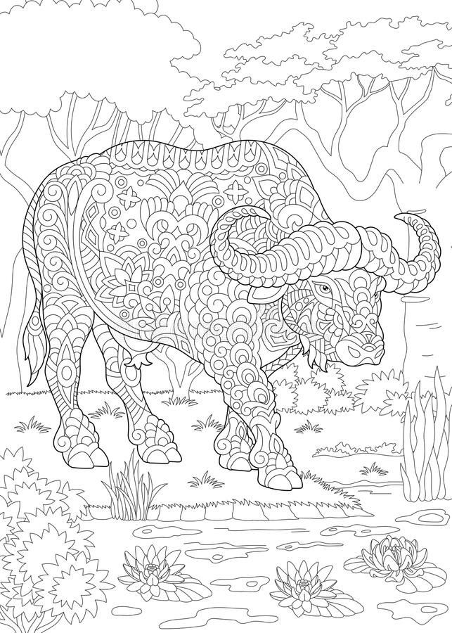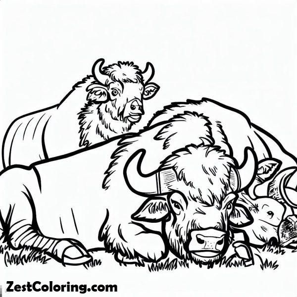 A coloring page featuring two buffalos peacefully lying in the grass, suitable for both adults and children to color.