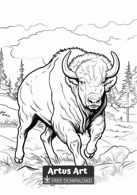 A coloring page featuring an adult bison running through the grass with trees in the background, designed for adults.