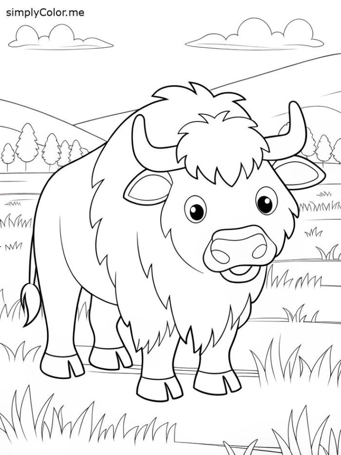 A cartoon bison standing in the grass with mountains and trees in the background, designed as a coloring page.