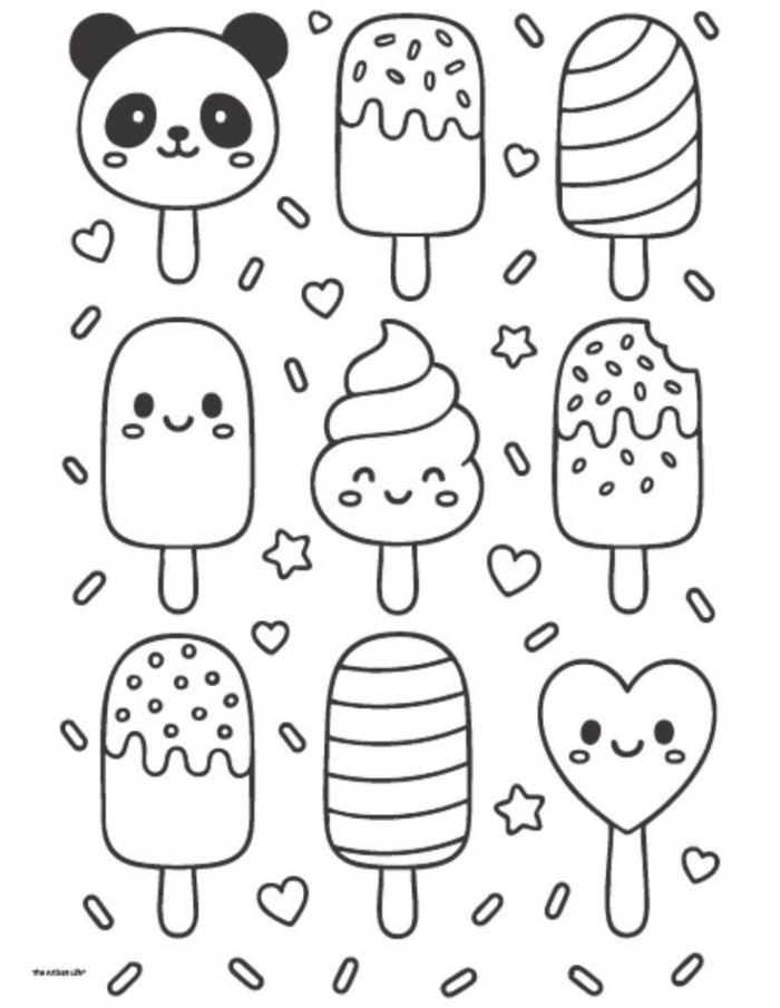 A black-and-white coloring page showcasing adorable ice cream treats like popsicles and a sundae, adorned with hearts and stars, perfect for kids’ activities and food coloring fun.