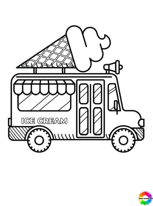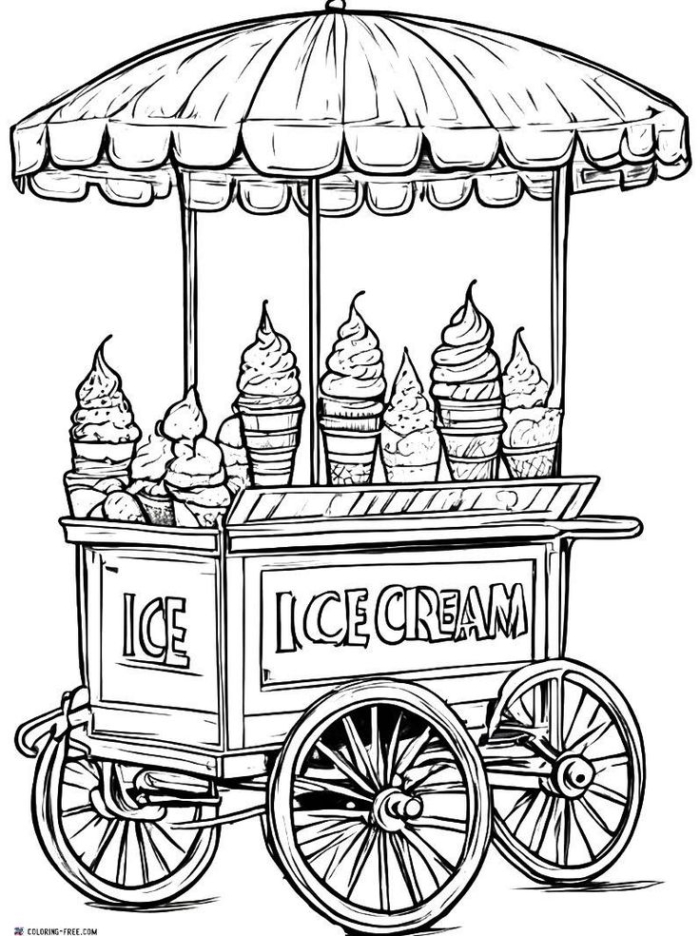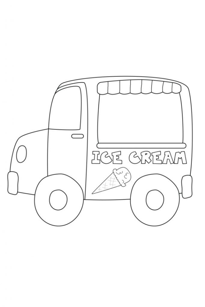 A coloring page features an ice cream truck with the words “Ice Cream” written in black and white on its side.