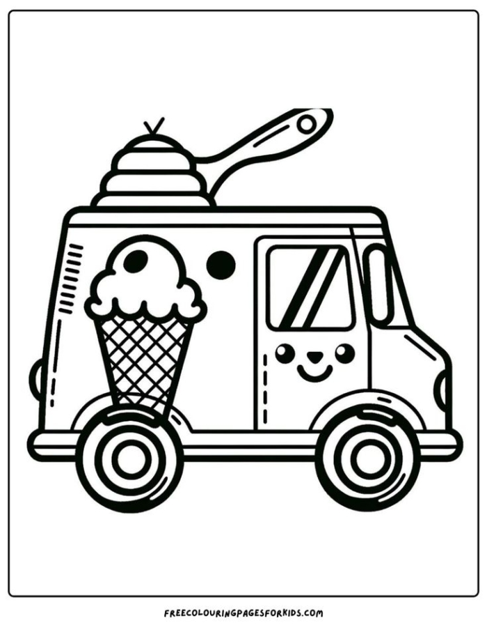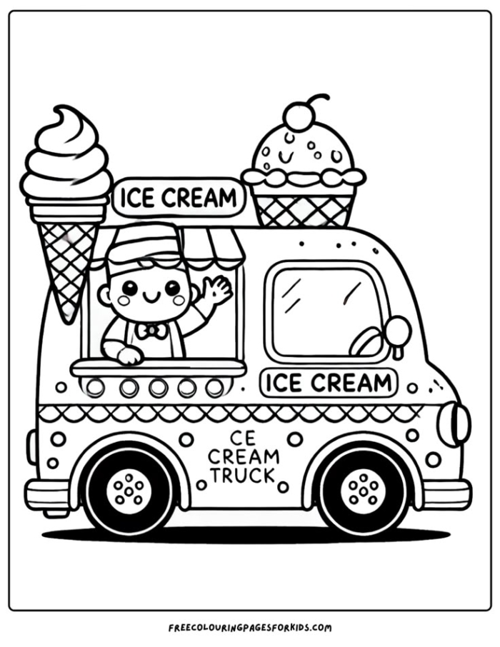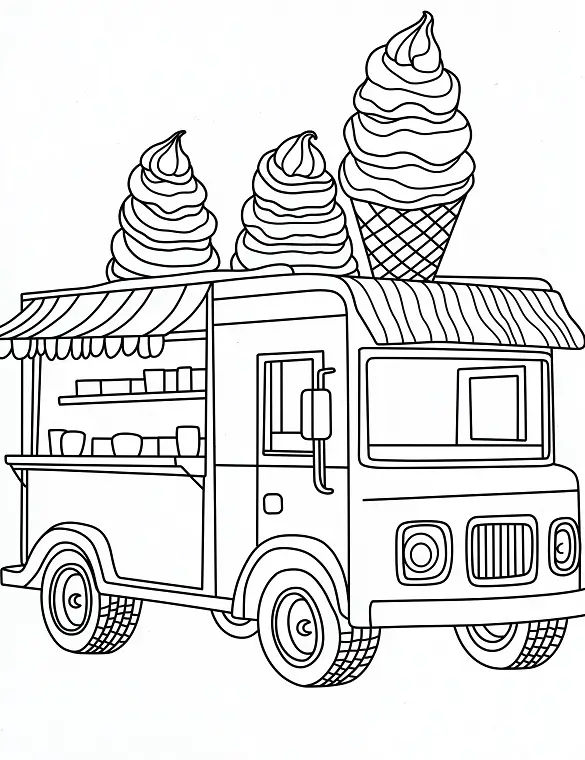 A playful coloring page featuring a cheerful ice cream truck topped with a giant ice cream cone, staffed by a friendly vendor ready to welcome young artists.