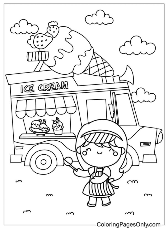 A coloring page featuring an ice cream truck with a girl standing in front of it and the words “Ice Cream” displayed above.