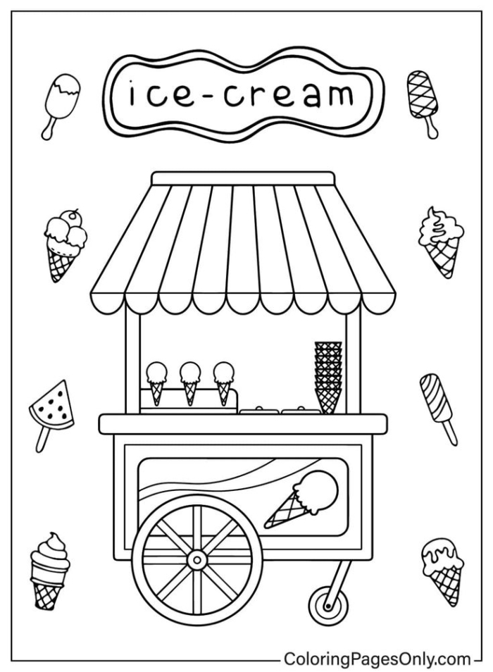 A fun ice cream truck ready to be colored with cones, popsicles, and tasty treats displayed on its sides.