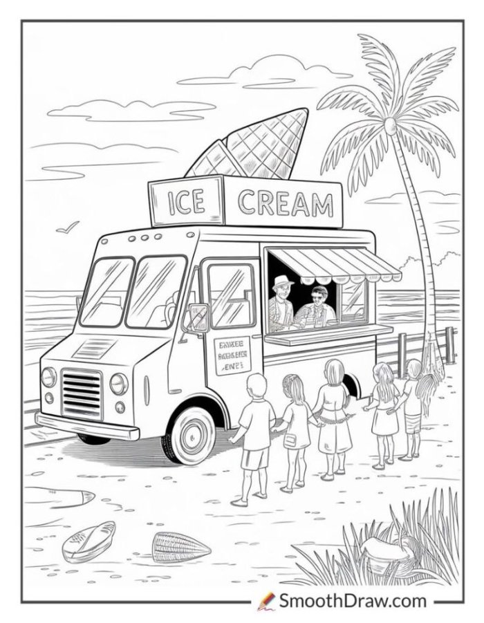 A fun coloring page featuring an ice cream truck driving along the beach, perfect for kids to print and color.