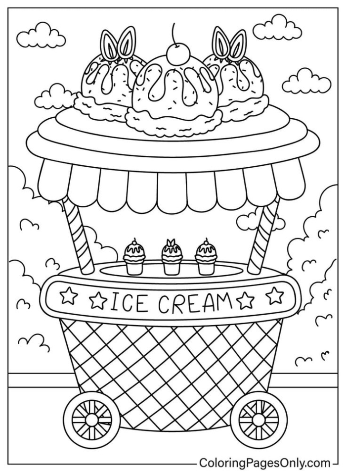 A coloring page featuring an ice cream cart filled with numerous toppings and the words “Ice Cream” displayed on it.