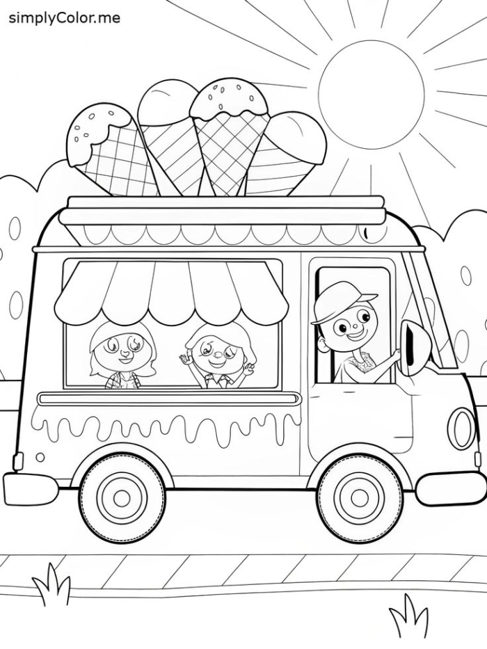 A fun coloring page featuring an ice cream truck decorated with various treats and kids enjoying ice cream.
