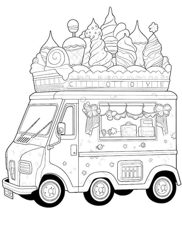 A fun coloring page featuring an ice cream truck surrounded by delicious treats and cheerful designs.
