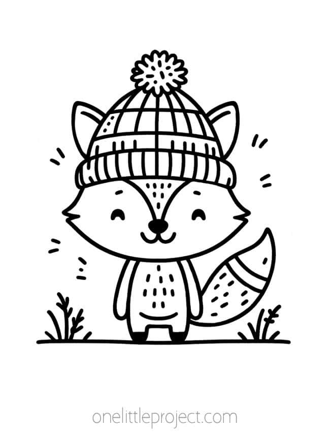A black and white line drawing of a fox wearing a knitted hat with a pom-pom on top, designed as a coloring page image.