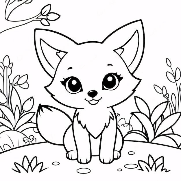 A adorable small fox peacefully sitting in the grass surrounded by flowers and leaves at its feet, perfect for coloring.