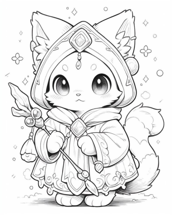 A charming illustration of a fox girl wearing a kimono, designed as a watermark-free coloring page perfect for kids to enjoy and personalize.