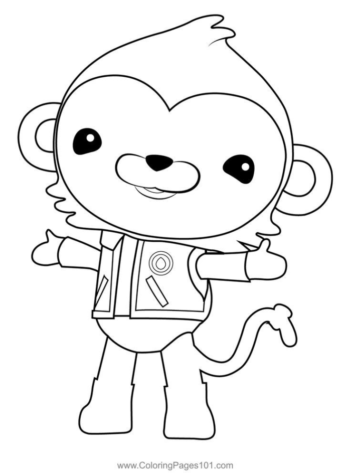 A monkey with stars and the word “Monkey” on its chest, sitting in front of a background ready to be colored.