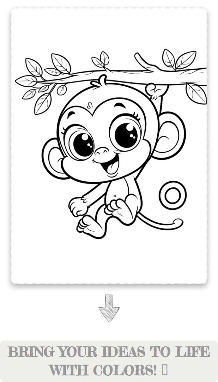 A playful monkey hanging from a branch, with leaves on its tail and wide-open eyes, ready to be colored.