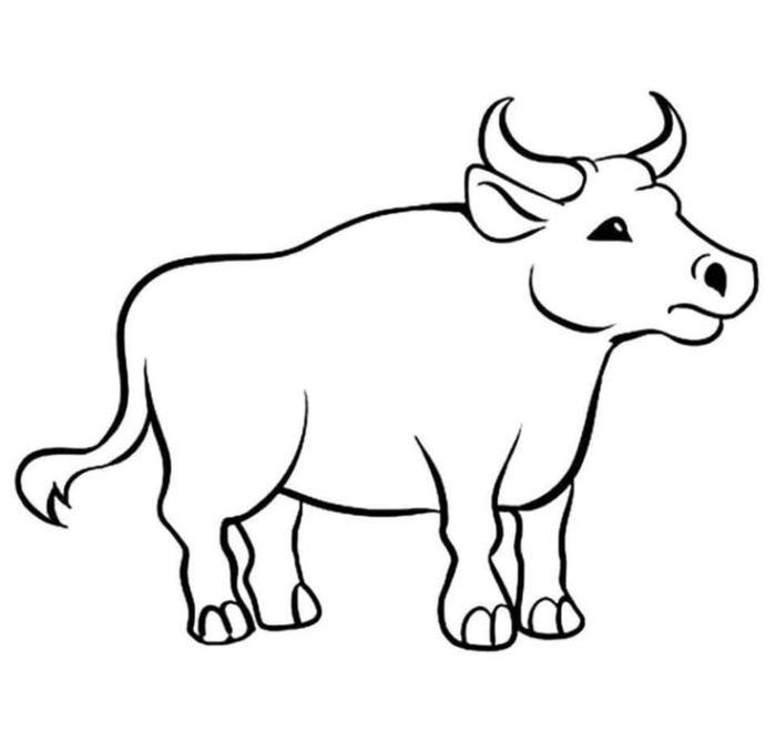 A simple black-and-white outline of a bull standing in front of a plain white background, ready to be colored.