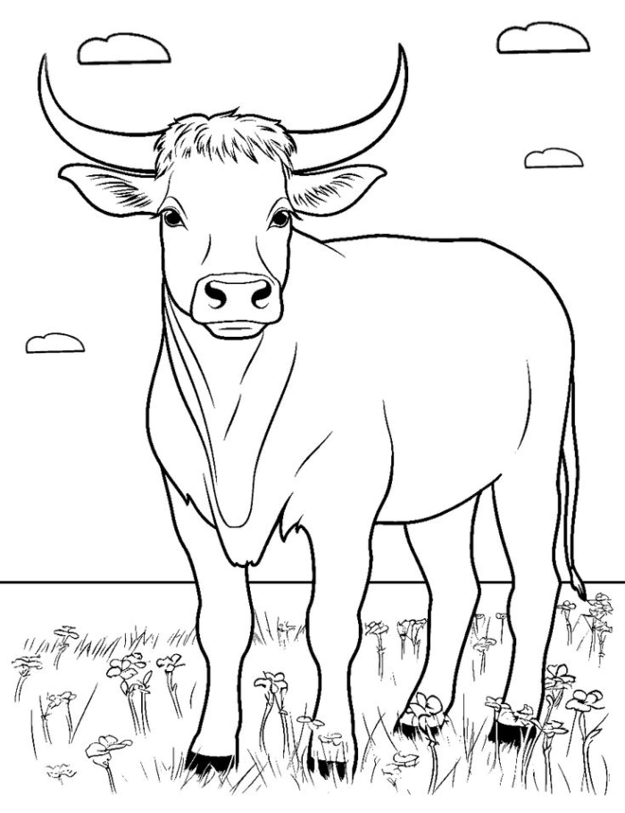 A black and white drawing of a bull with large horns standing in the grass and looking at the viewer, designed for coloring.