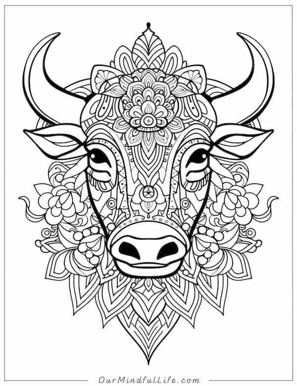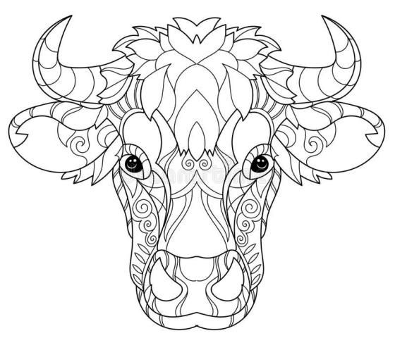 A coloring page featuring the head of a bull adorned with intricate decorative patterns on its face, suitable for both adults and children.