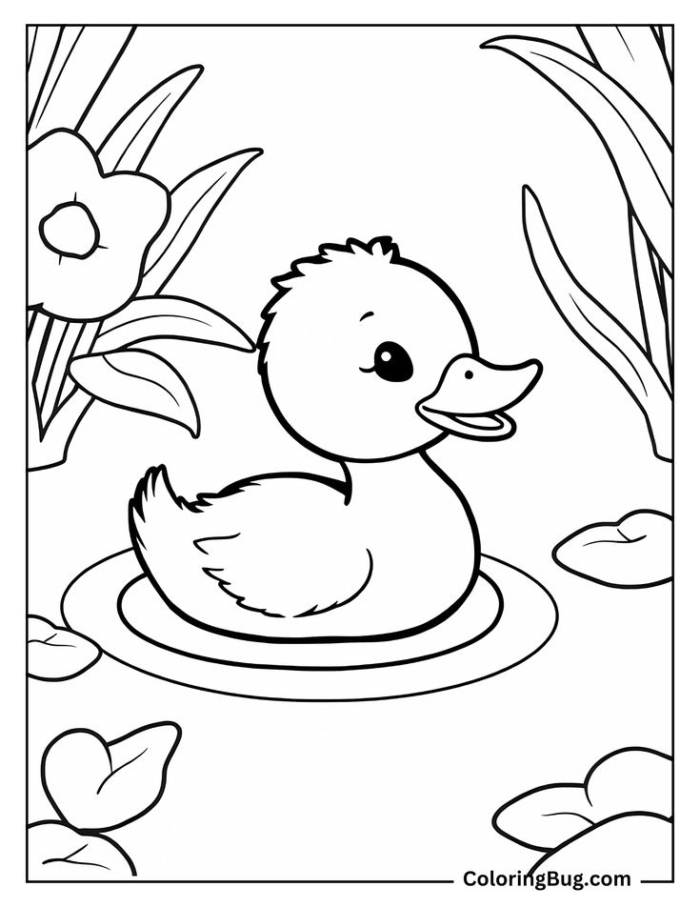 A coloring page featuring a cute duckling swimming in a pond surrounded by lily pads and tall reeds, perfect for kids to color.