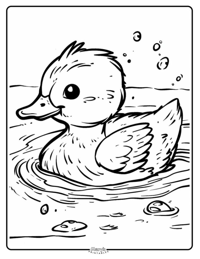 A serene illustration of a duck gracefully swimming on a pond, ideal for a calming coloring activity; free to download at Marysprintables.com.