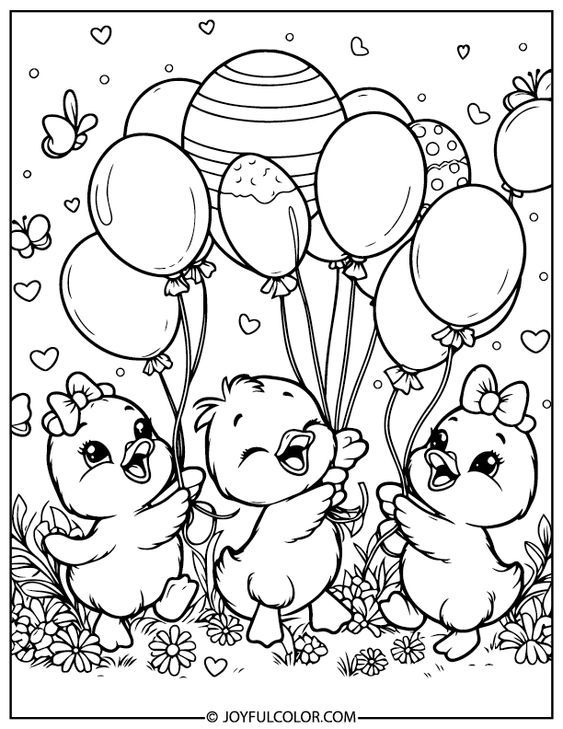 A coloring page featuring two small birds holding balloons, sitting in the grass, suitable for both adults and young children to color.