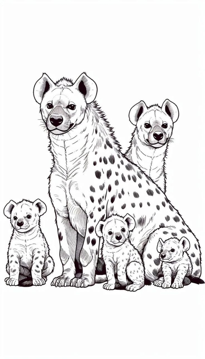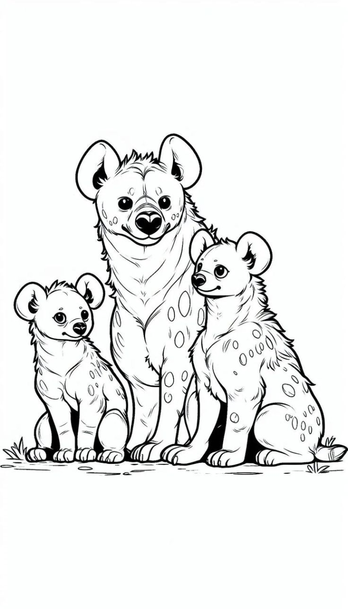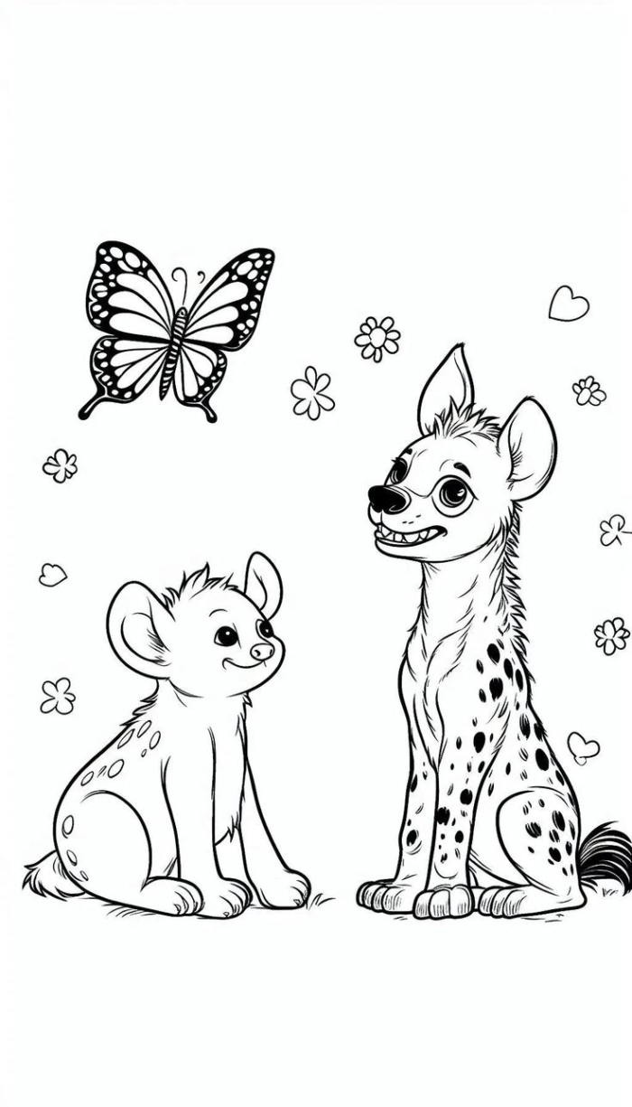 A hyena family coloring page suitable for both adults and children, featuring two adorable baby hyenas.