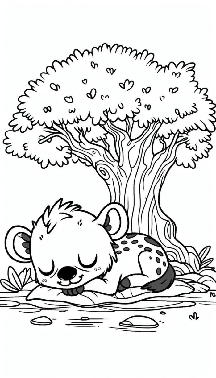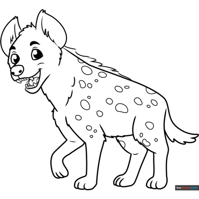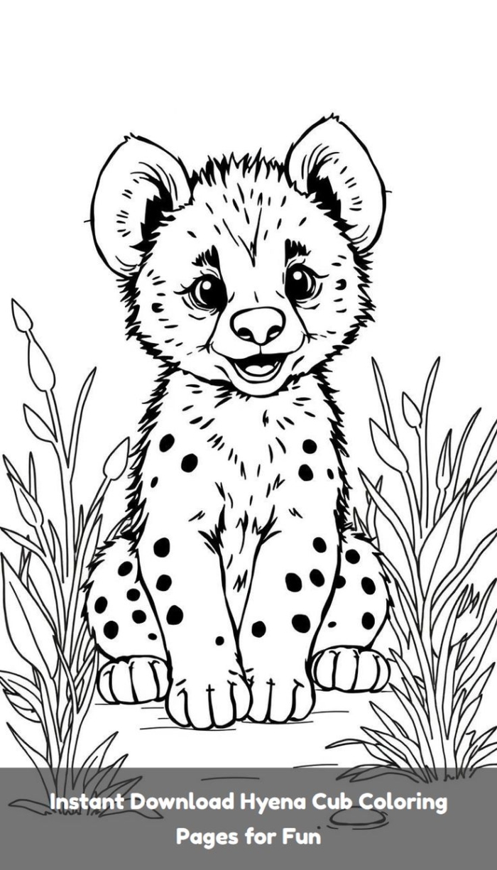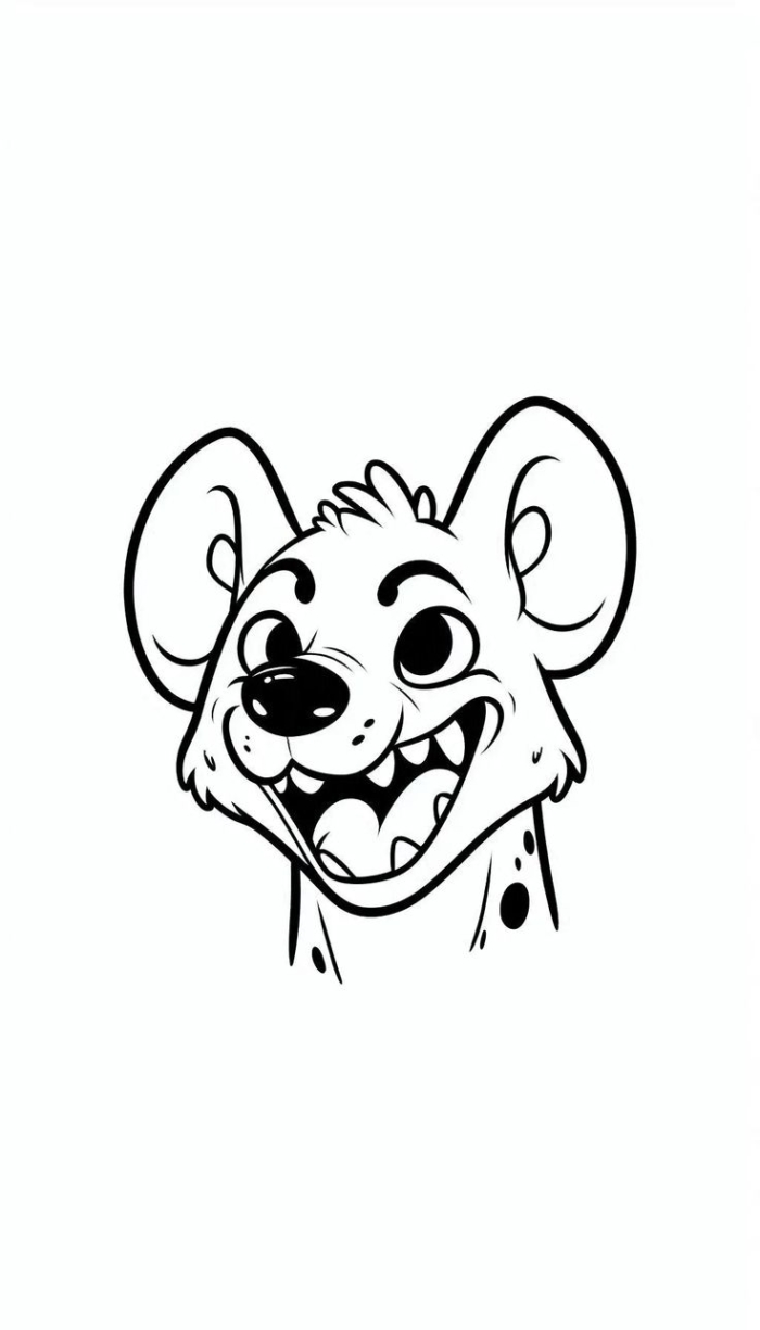 A adorable cartoon hyena with big eyes, a playful smile, a fluffy mane, and spotted fur, perfect for children’s coloring fun.
