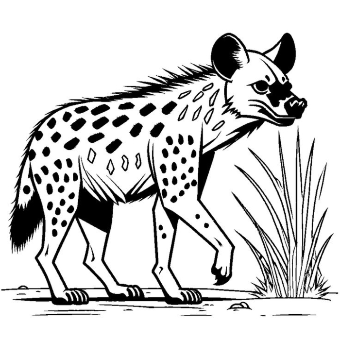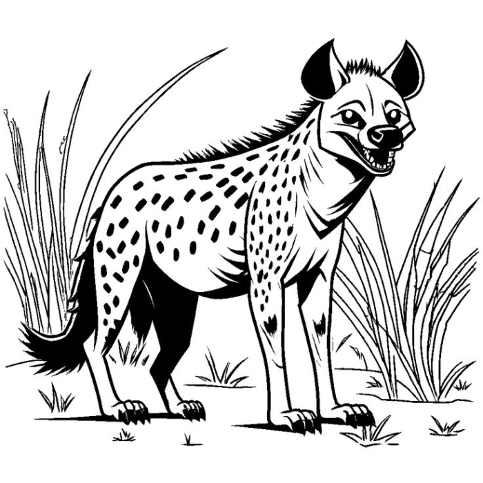 A free printable coloring page featuring a spotted hyena walking through tall grass, perfect for kids.