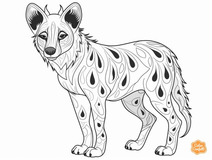 A fun hyena coloring page featuring a playful hyena standing proudly with bold lines ready to be colored.