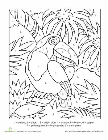 A vibrant printable color-by-number page featuring a cheerful toucan surrounded by tropical foliage.