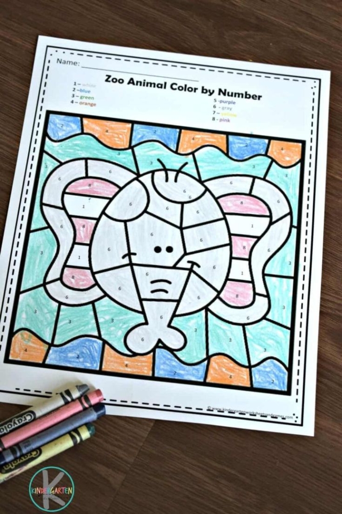A zoo animal color-by-number coloring page designed to help kids practice matching numbers, as well as add and subtract, while coloring fun animal pictures.
