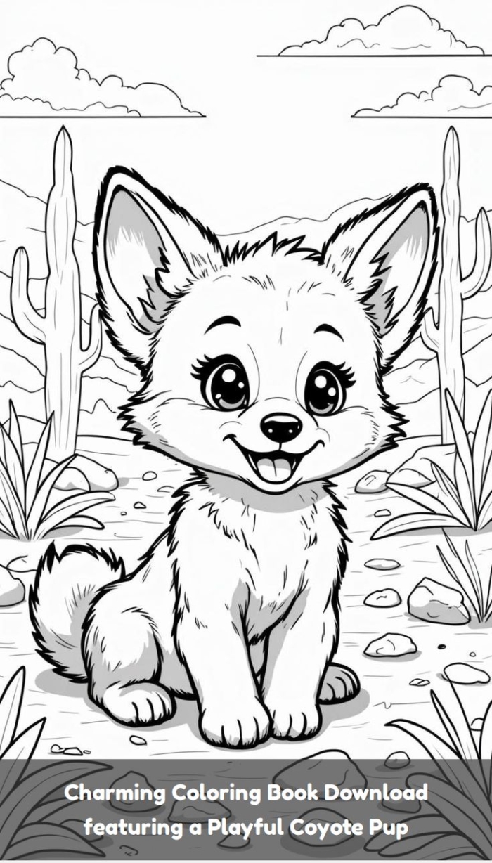 A printable coloring page featuring a detailed illustration of a coyote in the desert landscape, available for instant download.