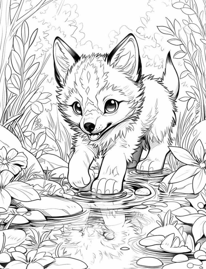 A charming coloring page featuring a playful fox cub splashing in the water, surrounded by delicate flowers, suitable for both adults and children.