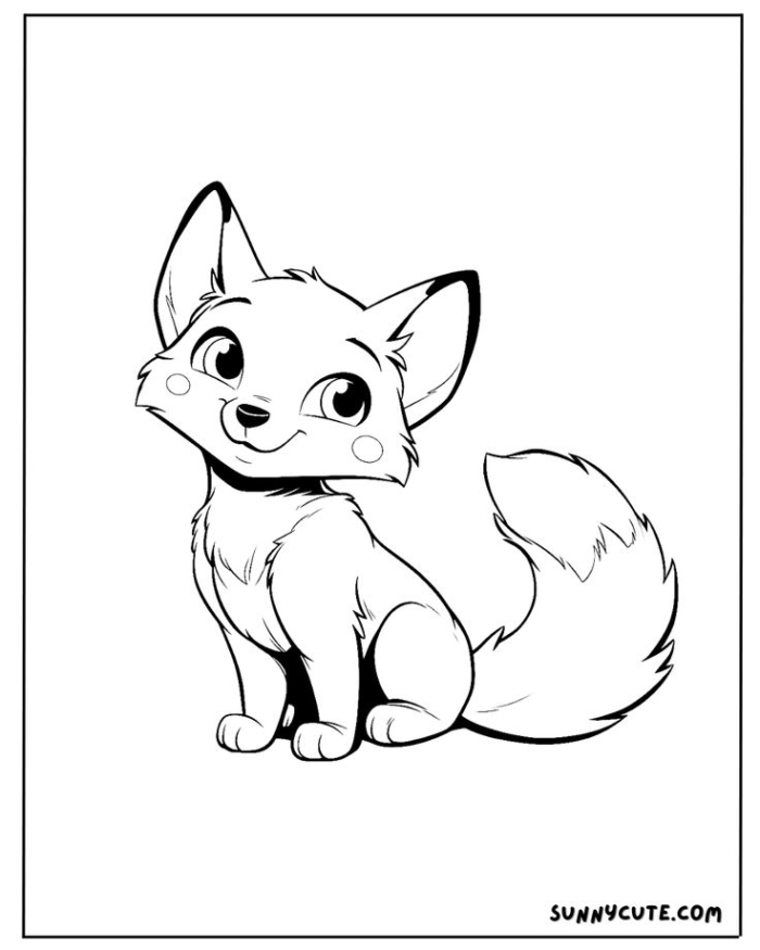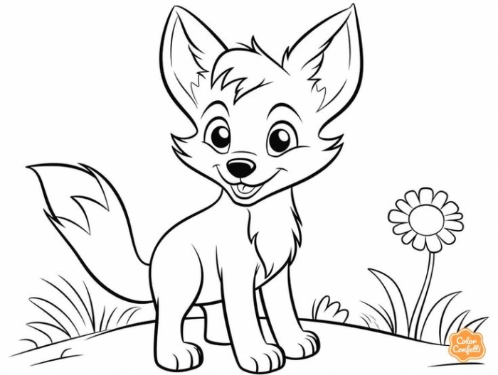 A coloring page featuring an adult fox sitting on the ground with flowers in the background and the word “coloring” displayed.