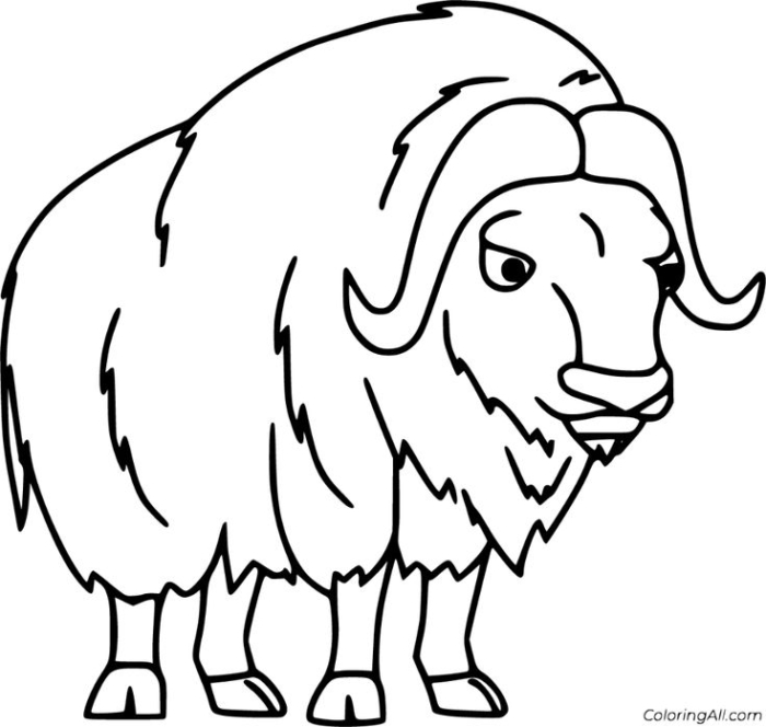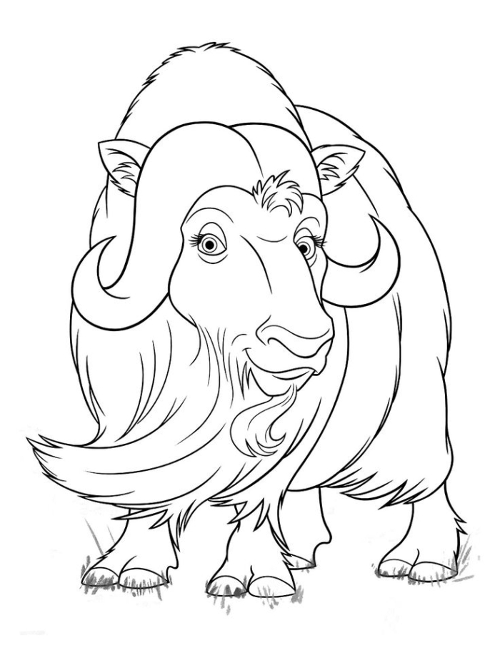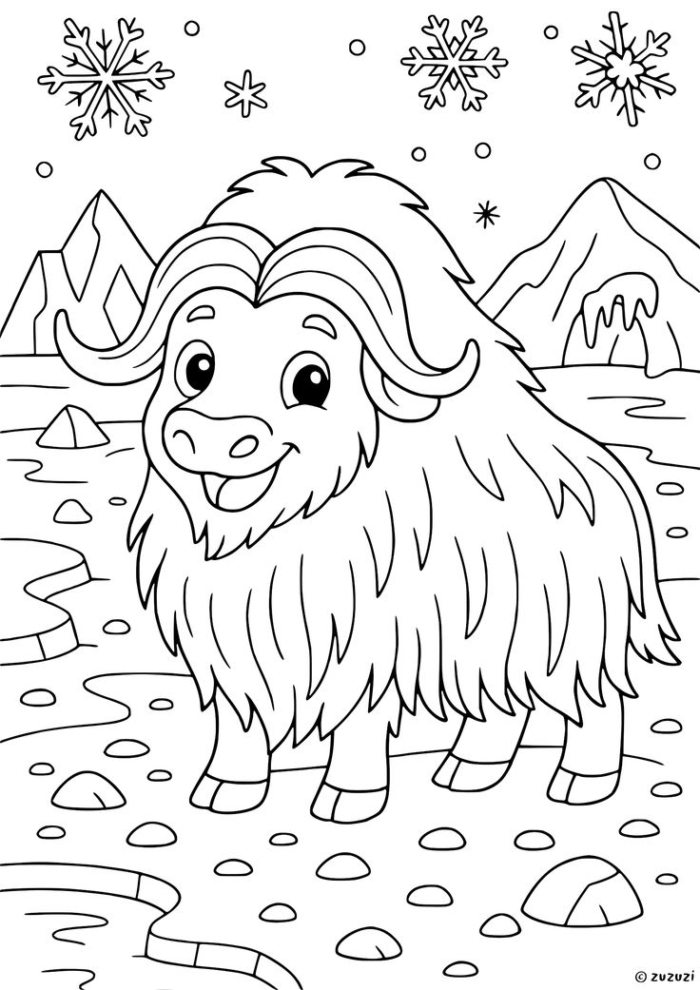 Discover the adorable musk ox, a fluffy, goofy-grinned Arctic friend with wild wool, perfect for winter coloring enjoyment.