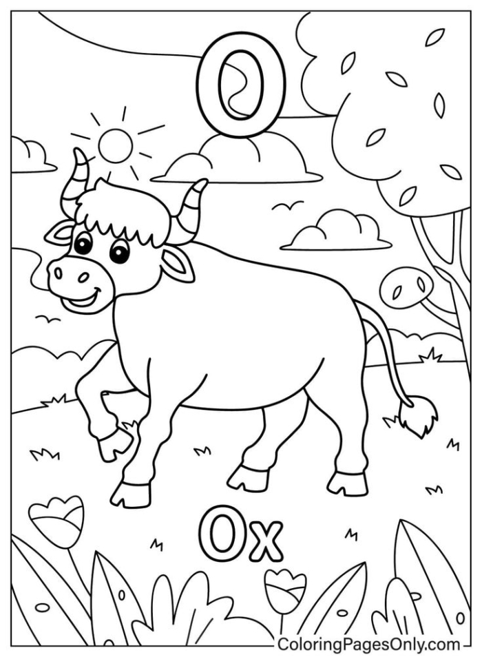 A coloring page featuring the words “Draw an ox” with simple illustrations of an ox and an “X” for children to color.
