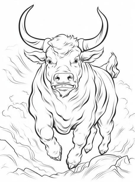 A black and white line drawing of a bull with horns on its head, standing in a ready position, perfect for coloring.
