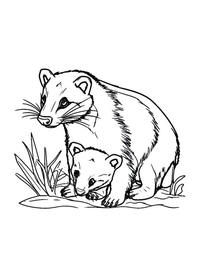 A coloring page featuring an adult ferret and her baby walking together in the grass, perfect for kids.
