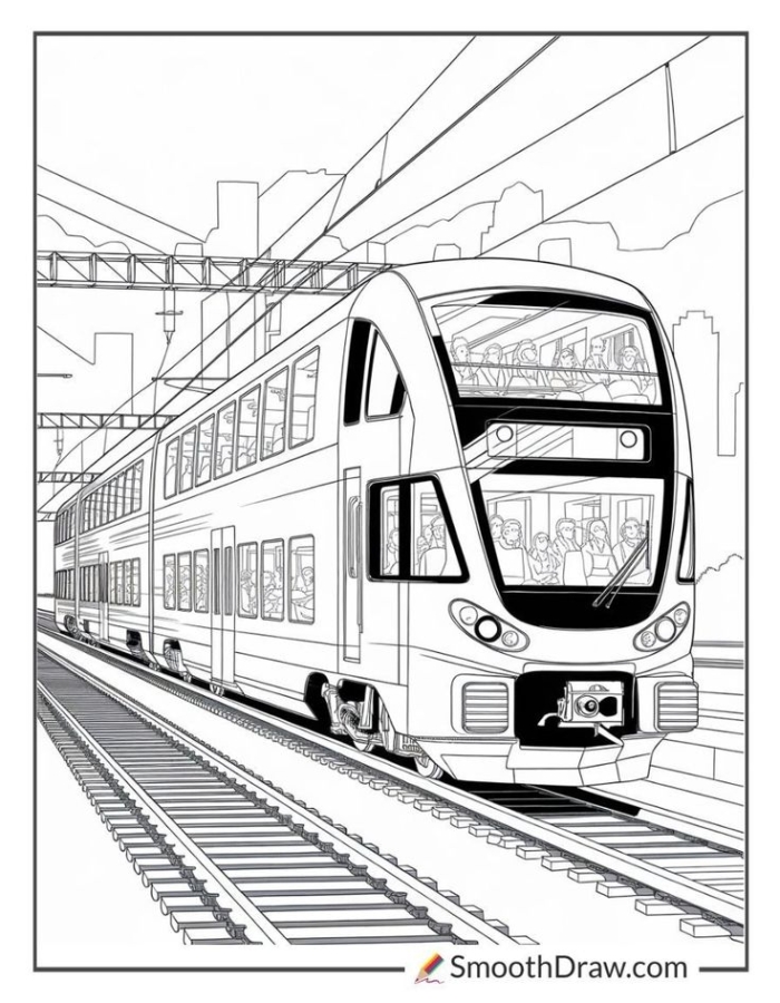A coloring page featuring a train traveling along railroad tracks, suitable for both adults and children to color.