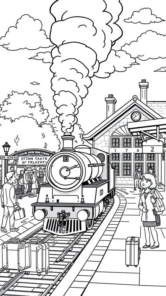 Enjoy these printable Steam Train coloring pages featuring transportation scenes, train tracks, simple locomotive outlines, and designs suitable for all ages, including preschool crafts and adult coloring fun.