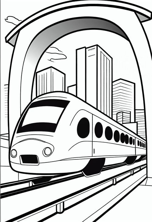A black and white line drawing of a train moving along the tracks with buildings in the background, ready to be colored.