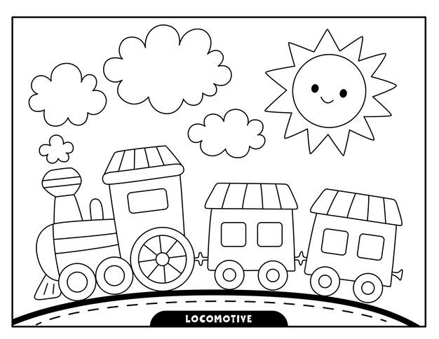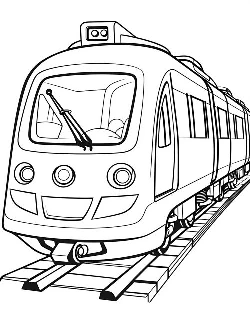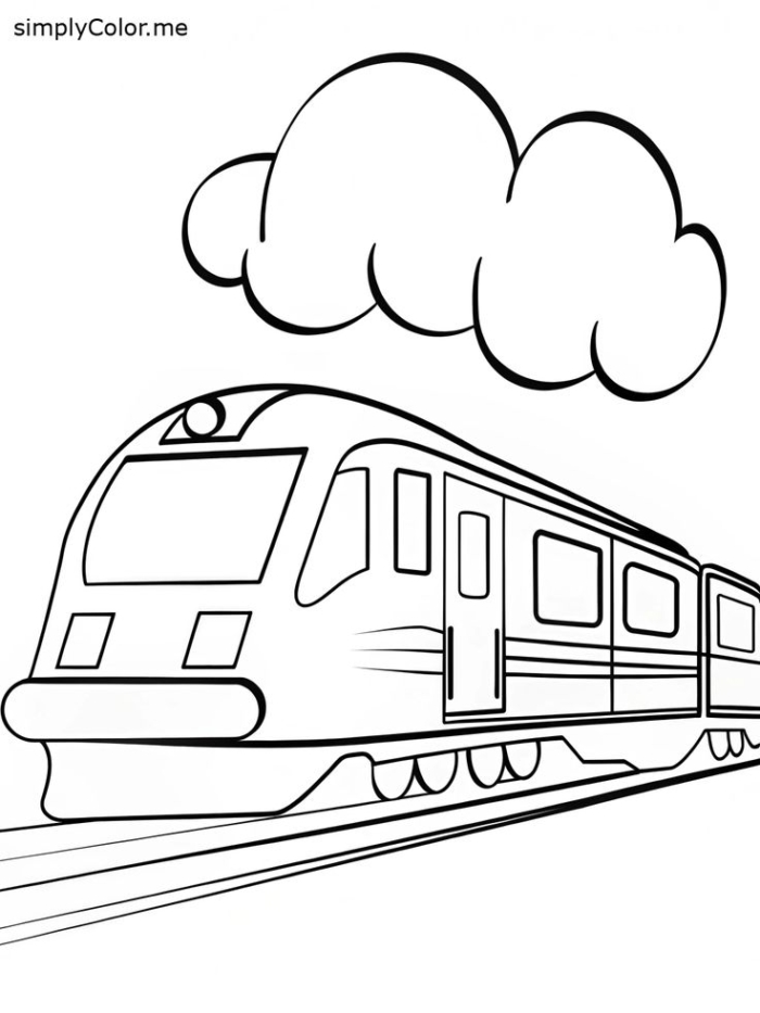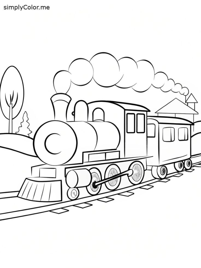 A fun coloring page featuring a train traveling along the tracks, perfect for kids to color and practice drawing skills.