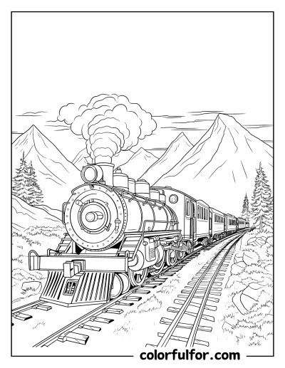 A black and white line drawing of a train winding through mountainous scenery, perfect for coloring.