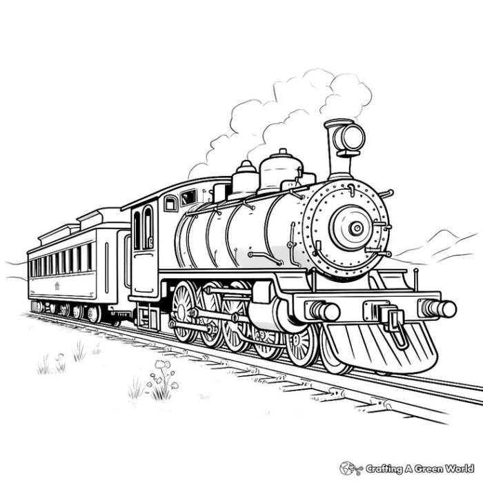 A printable coloring page featuring a detailed outline of a steam train engine and train, perfect for coloring and transportation-themed activities.