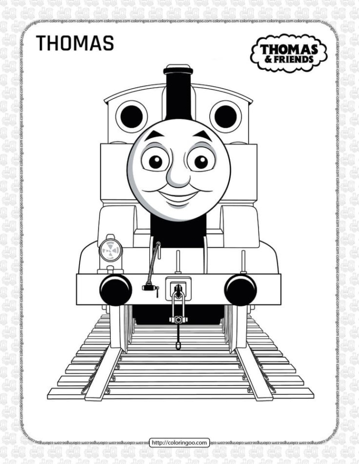 A printable coloring page featuring Thomas the Train traveling along the tracks, perfect for kids to color and enjoy.