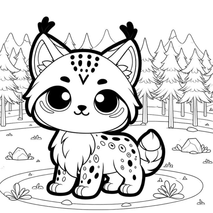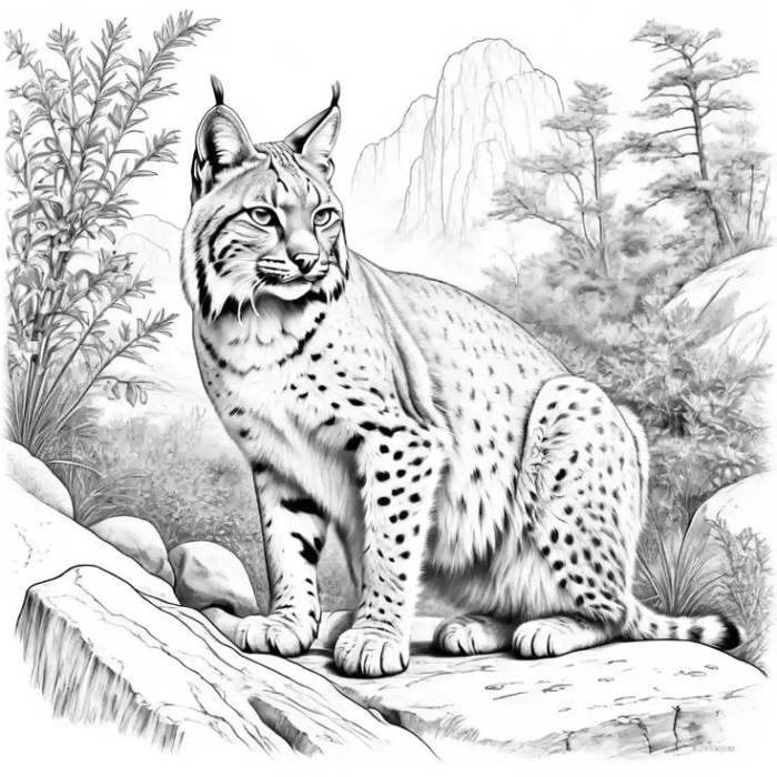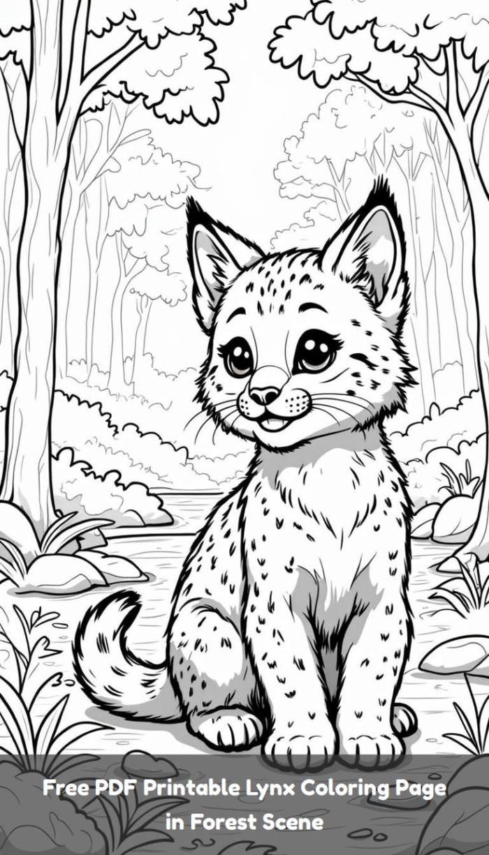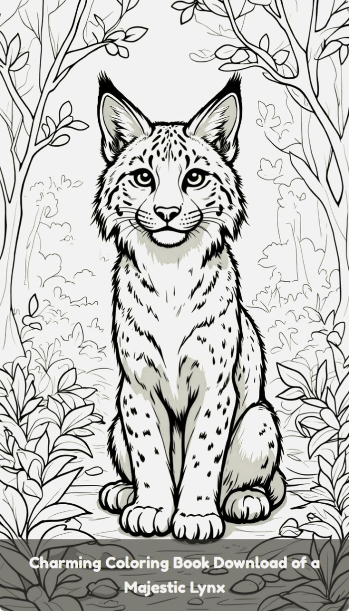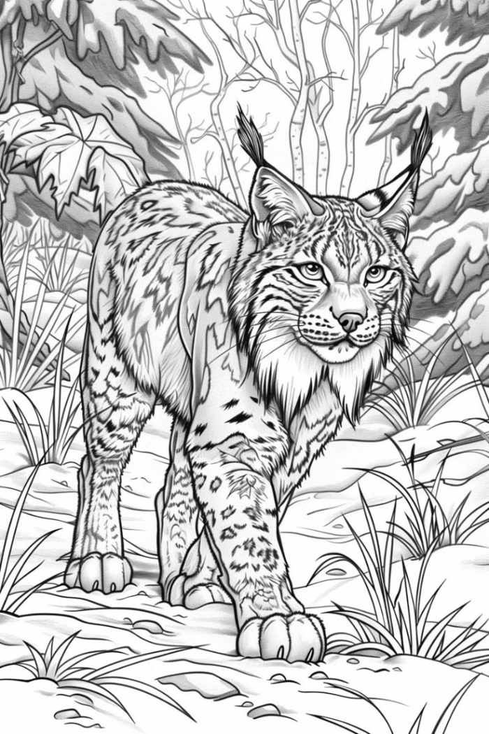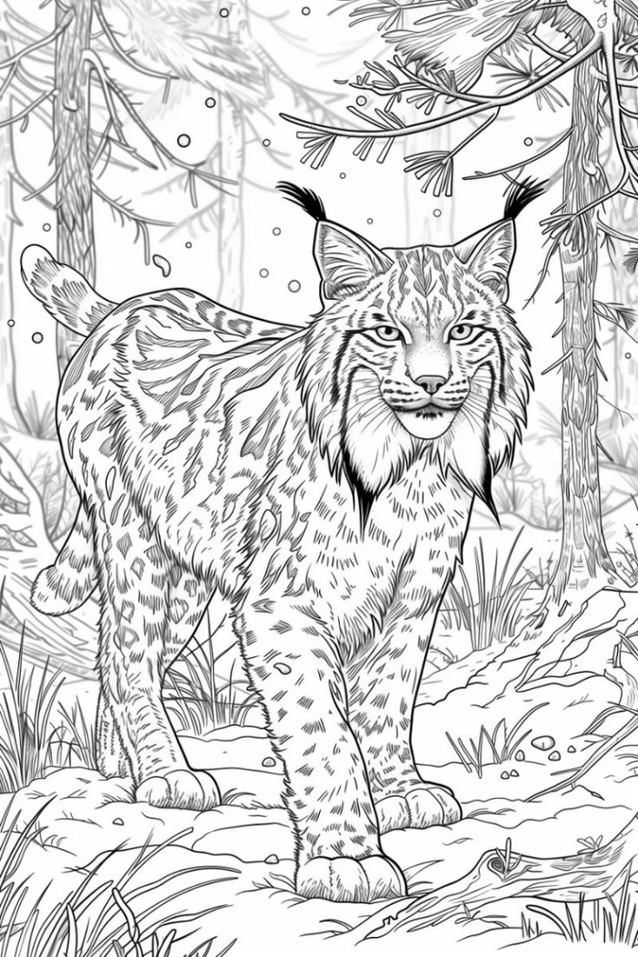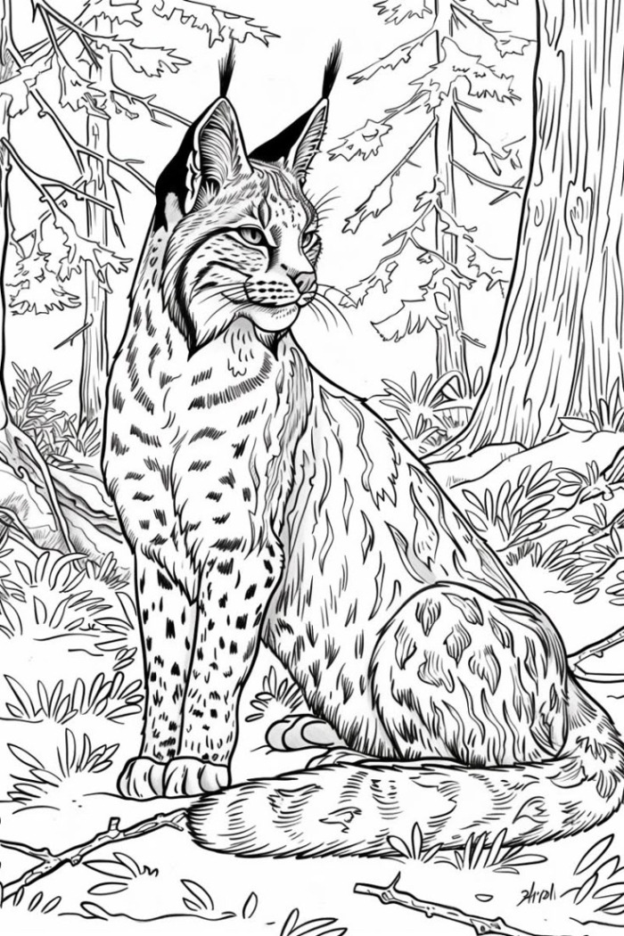 A coloring page featuring a lynx sitting in the woods with trees in the background, designed for both adults and children.