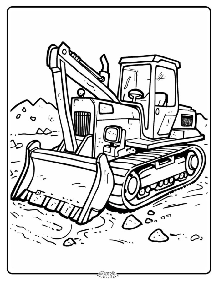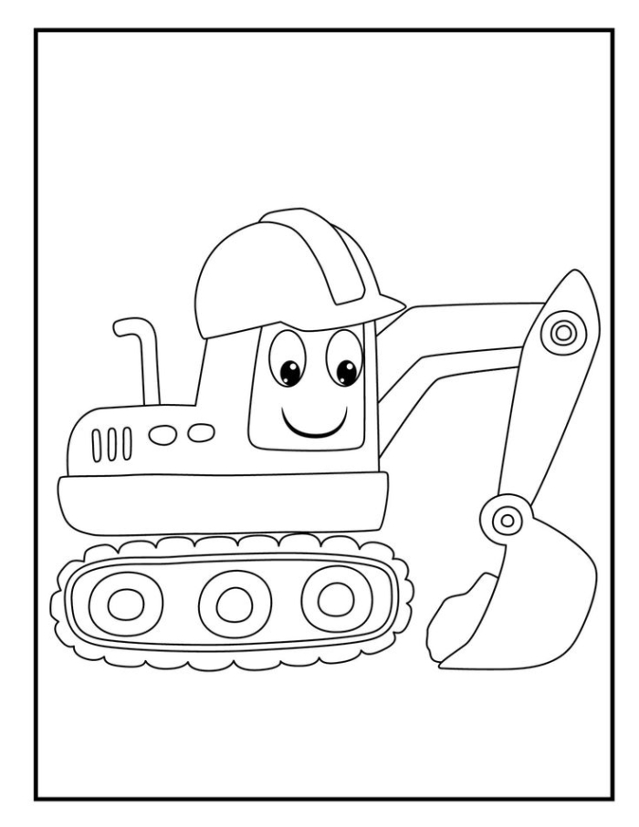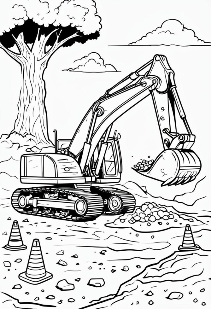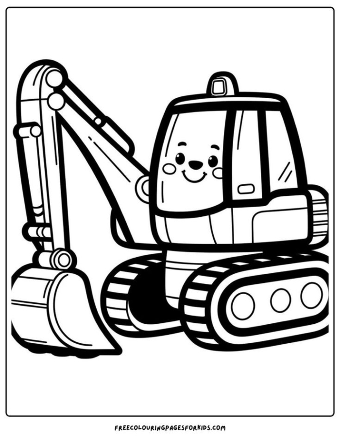 A fun and detailed excavator coloring page featuring a large construction vehicle for kids to color.