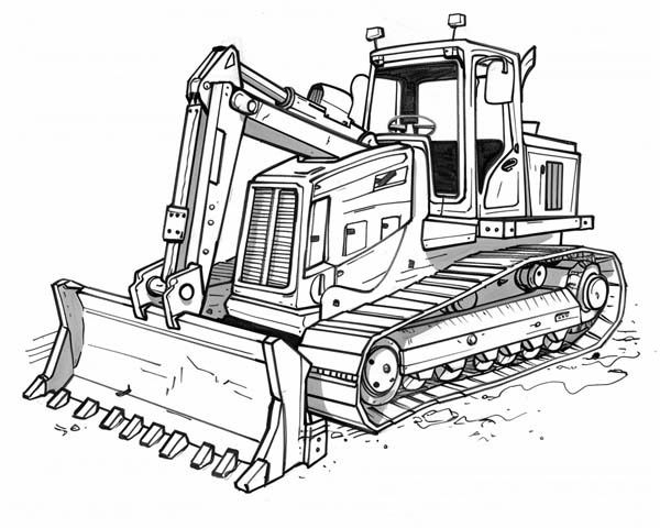 A black and white coloring page showing a construction vehicle working in the dirt with trees in the background.