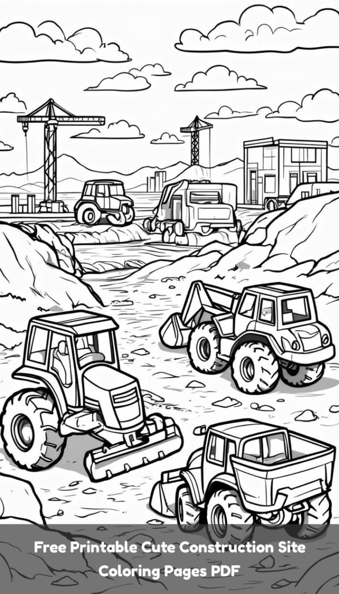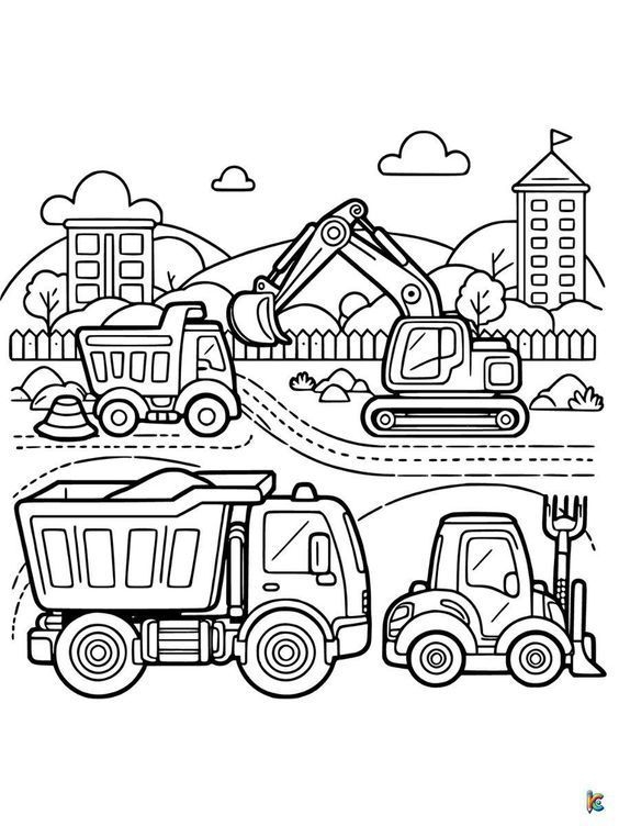 A fun and engaging coloring page featuring construction trucks, perfect as a free printable worksheet for kids.