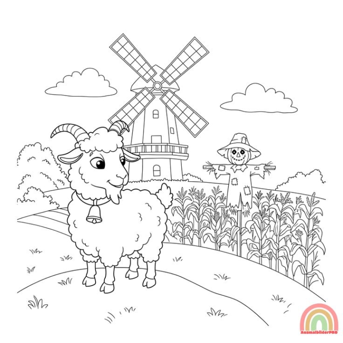 A black and white sheep standing in front of a windmill, flanked by two scarecrows, all ready to be colored.