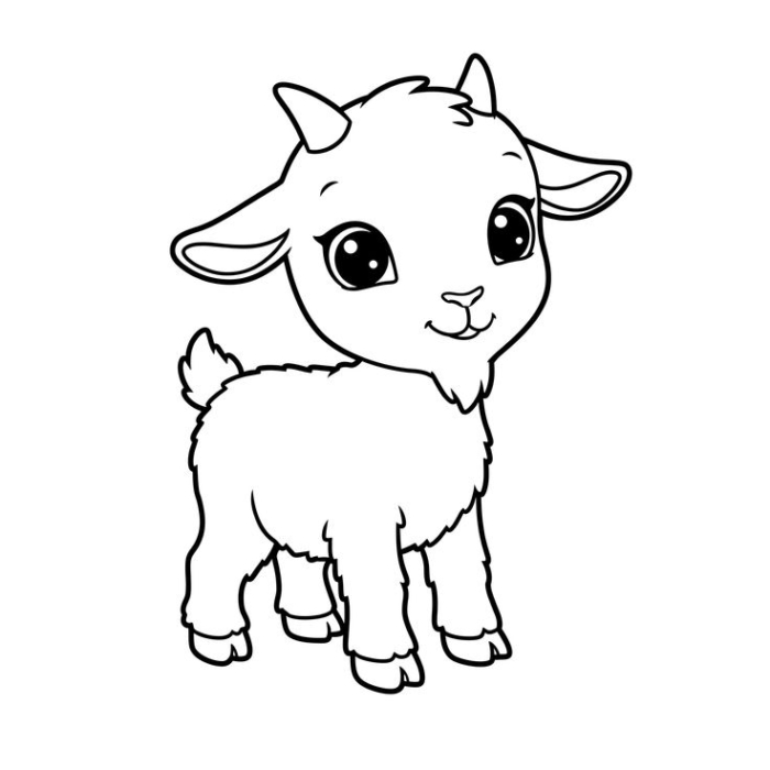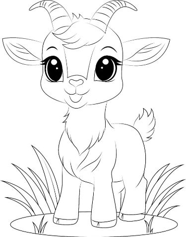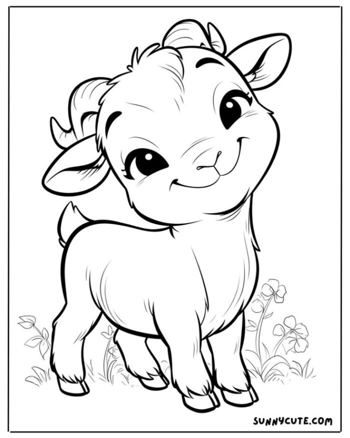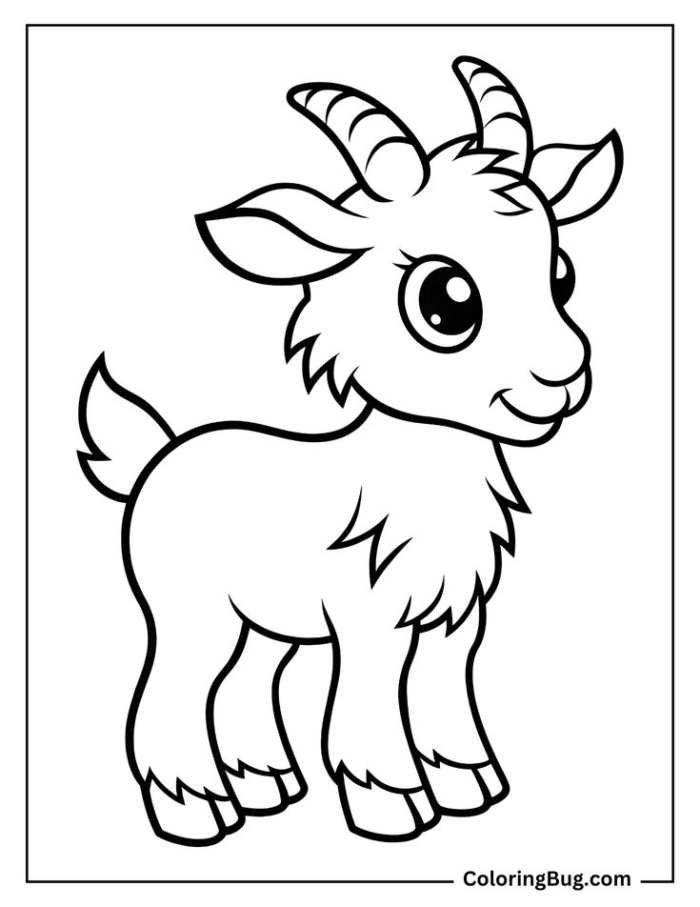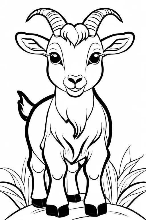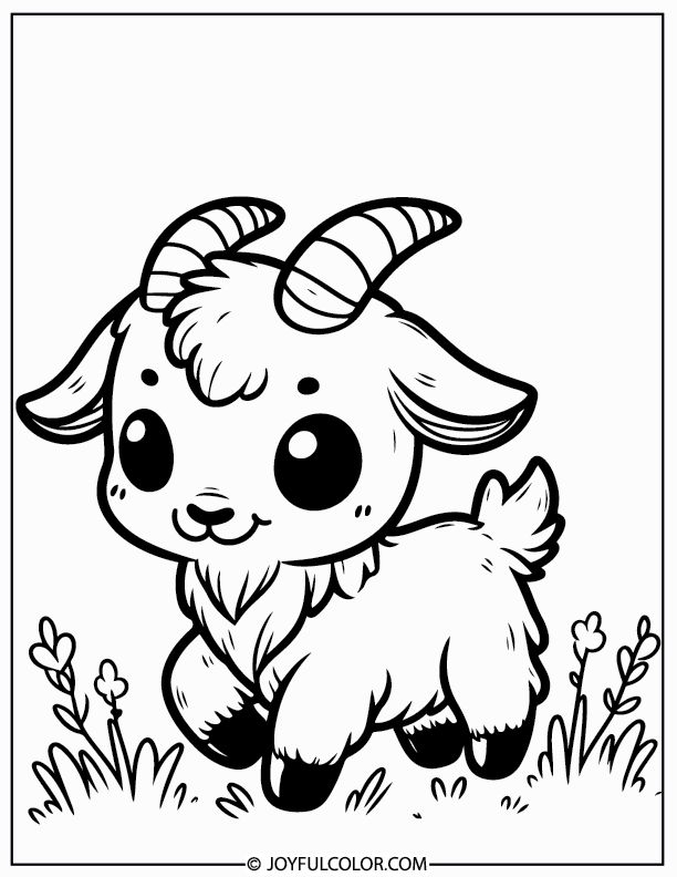 A delightful coloring page featuring a adorable little goat with large eyes and small horns for kids to print and color.