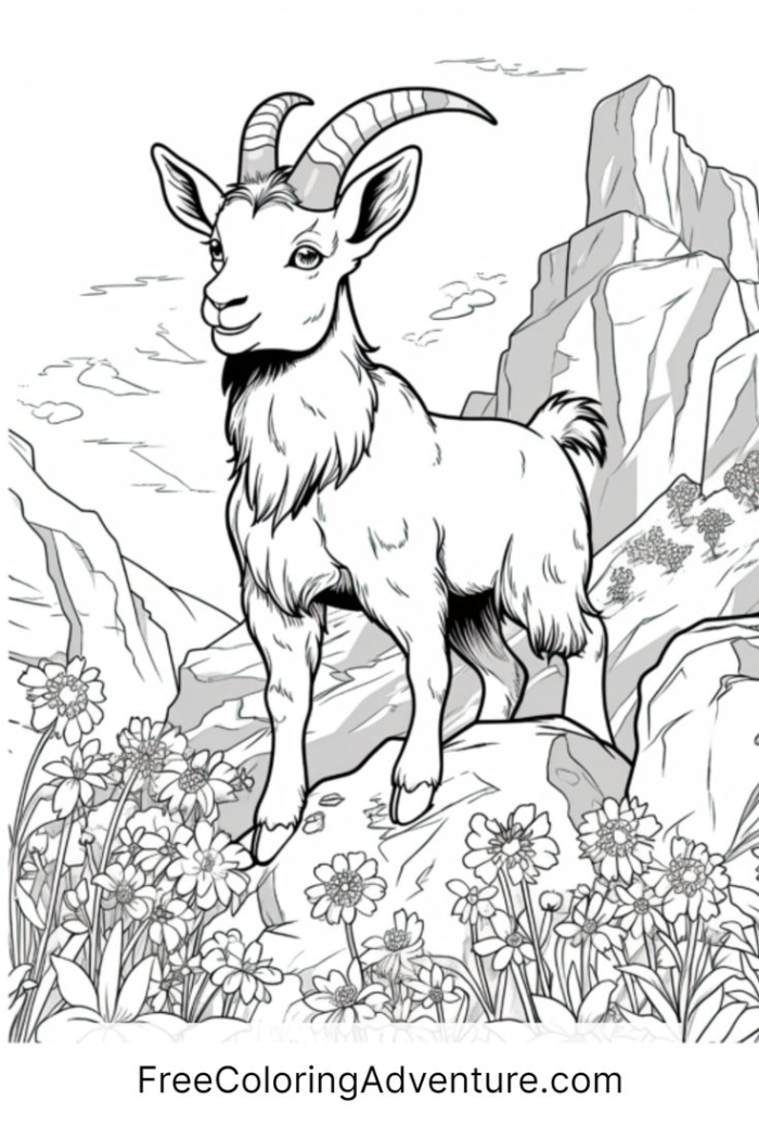 A goat standing atop a mountain with flowers in the foreground and distant mountains in the background, perfect for coloring.